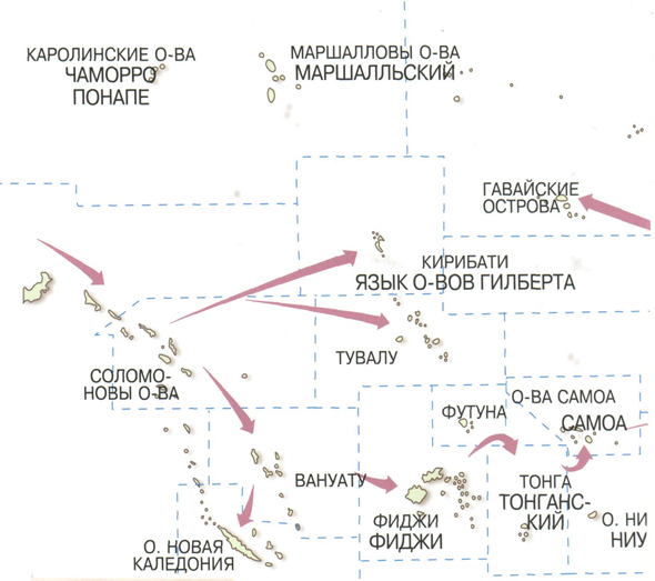История развития языков здесь совпадает с историей освоения Океании: наличие